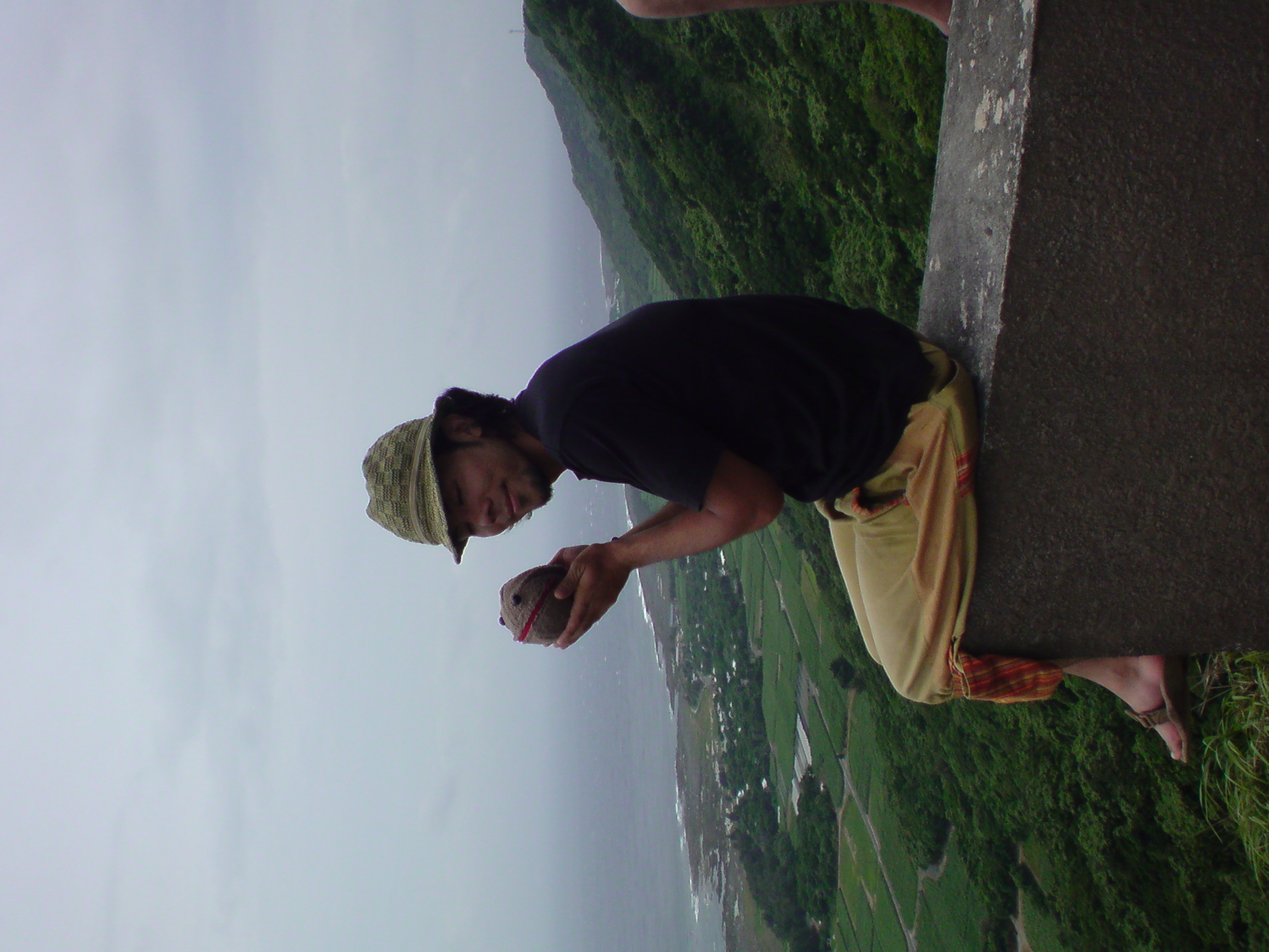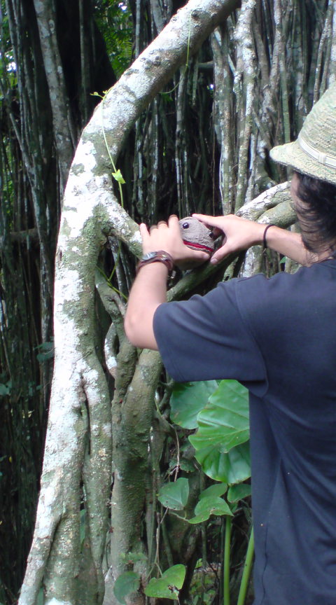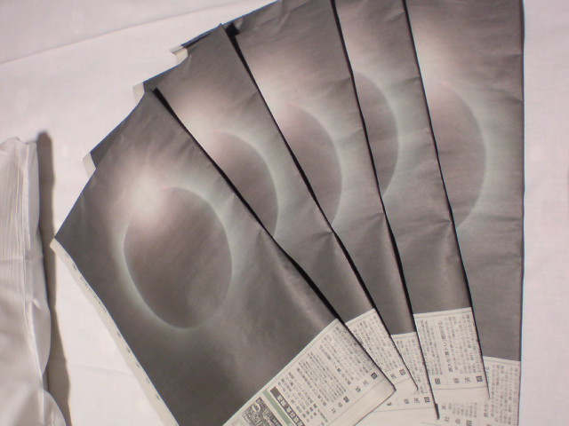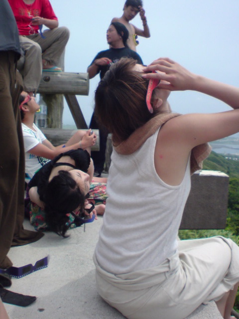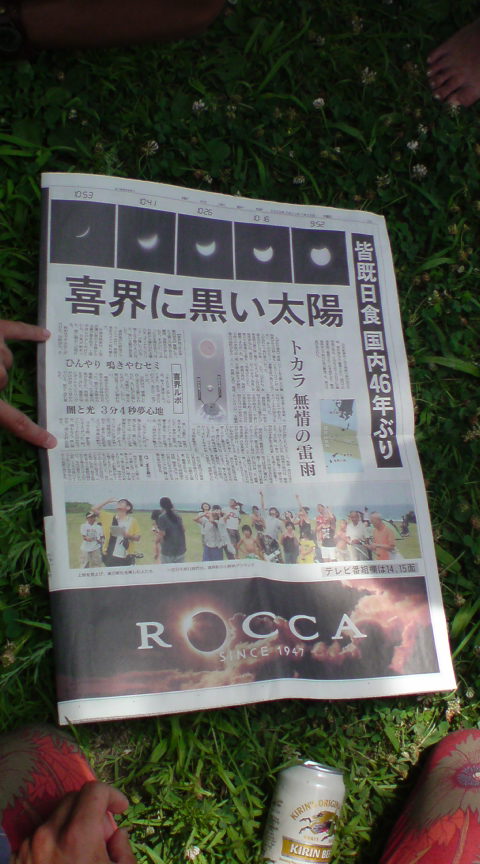 皆既日食は喜界島で一番標高が高いという百之台公園の展望台で観測しました。 ここに落ち着くまで、ビーチで観るプランやサトウキビの一本道派等と意見が分かれて直前まで決まらなかったのを、火付盗賊NORIさん自ら動いて説得。太平洋と東シナ海を一望に見渡せる360°のパノラマビューに軍配が上がりました。 21日のパフォーマンスを終えてから場所取り隊(大ちゃん・ツル君・ヒロさん・nijiko・私)が4時過ぎに先発。 パラパラと小雨が降るなか道に迷って『蝶に超注意』という標識に遭遇して爆笑したりと、紆余曲折ながら何とか夜明け前に目的地に到着。テラスの下で雨宿りしながら後発隊を待つ、、、 8時頃には救援物質(=食料+飲み物)を抱えた後発隊と合流。その間に来たのは2組くらい、、、場所取りなんて必要無かった?(^_^;) 島の人は「普通に仕事だから」って言ってたのはこの事かー。 ▼9:33 高くなってきた太陽が徐々に欠け始める。真上から欠けるのは皆既日食経験者の大ちゃん・NORIさんも初とあって一気に興奮の渦に。 日食メガネをかけて空を見つめる集団、何とも80'sテクノな絵ww ▼10:10 半分くらい欠けた辺りから太陽の回りに大きな真円の虹がくっきりと現れ、その虹の内側だけが魔方陣のように雲がスルリと抜けていく。 肉眼で虹を見続けると眩しさに目が眩んで日食メガネが真っ暗になるから我慢すりゃ良かったんだけど、信じられなくて何度も確認。紫から緑まで、肉眼だとかなりハッキリ確認できる。 この辺りから昆虫や鳥の鳴き声が聞こえなくなり、風の音も心なしか遠い。 空が徐々に暗くなってきて、琥珀色の空に浮かぶ金色の太陽と虹、皆既日食の直前には二重の虹にΣΣ(◎Д◎) ▼10:55 同じ展望台で観測していた沖縄から来た天文マニアのあーきぃさん達がカウントDownしてくれている ▼10:56 遂に世紀の瞬間★薄闇に浮かぶ真上の太陽が黒くなり、太陽の回りに青白い輪が細く光っている。 間もなくピンク色のダイヤモンドリングが音もなく薄闇の世界を切り裂く。肉眼でもはっきりと確認でき、欠け終わりは涙でよく見れなかったくらい。 虹の内側だけ魔方陣のように雲が避けて通っていく、実にMysteriousな一時間でした。 終わった後は感動の余韻を噛み締めながらガジュマルの大木が群生する森へ。樹齢850年の巨大な根っこの滝にカメラ小僧達が俄然張り切り始めるww 大ちゃんが武幻を手にツル君・ヒロさんを随えて動画撮影を開始。すごくプリミティヴで恰好良かった~~~ もう一ヶ所ガジュマルの大木があるというのでそちらも寄って、偶然会ったBombeiroファンのオバチャン達に揉まれながら鑑賞。素晴らしい。 日食の後に更に大地のパワーをドカーーーーンと感じ、天と地のエネルギーの対流というか磁場に、宇宙と神の存在を肌で感じた体験でした。 更に詳細なレポートはYutaさんの日記をご覧下さい↓ http://poicommunity.com/yutablog/2009/07/kikaijimanissyoku.php 日食の最中の動画はチュゲ君のYouTube↓ http://www.youtube.com/watch?v=4EkDhNbmuV0
