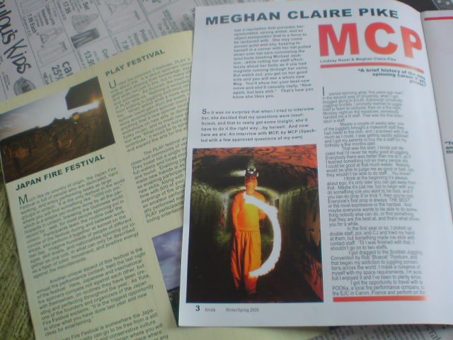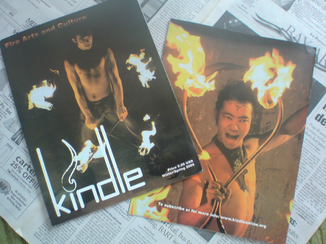 FireDrumsの会場で、世界初のファイアーパフォーマンス&アートマガジン“Kindle Magazine”創刊号を仕入れて来ました。 表紙を飾るのは日本が誇る世界的に有名なパフォーマー大ちゃんことdai zaobab(http://www.zaobab.com)巻末にインタビューが載っています。 また、巻頭特集はCOL2008でも鮮やかなコンタクトスタッフ捌きを見せていたスコットランド出身の達人MCP、他にも世界のファイアーコミュニテイやフェスティバルを取り上げ、アメリカのFireDrumsと共にJFF2008の記事も掲載されていて、この筋の人には堪らない内容なはず(笑) この記念すべき創刊号、一冊 ┏━━━━━━━━━━━┓ ┠$9.99⇒¥1000┨ ┗━━━━━━━━━━━┛ で先着30名様に販売いたします。 お近くの方は新宿雑技団の練習会等でお渡しできますし、郵送をご希望の場合はメール便(送料80円)でお届け出来ますので、コメントかメールいただけたら対応いたします。 FireDrumsのオーガナイザーでもあったNoel Yee曰く、季刊紙としてリリースしていきたいとの事で、次号は8月末に開催される〈Burning Man〉特集の予定だそうです。今から楽しみですねw Kindle Magazineウェブサイト↓ http://www.kindleonline.org/ 肝心の“FireDrums”のレポートはまたいずれ(;´∀`)ノ゛ At FireDrums,I got 30 of "kindle magazine" 1st issue. It's made by fire dancers who lived around Bay Area,California. This is the very first magazine of the fire performance and art whole around the world,and everything's so cooooool !!!! Famous Dai Zaobab had featured as a cover,his own and his beautiful Buugeng's interview, MCP's interview,lot of cool phoography,and so on. If U wanna get this memorial first fire artist's issue right now,send me e-mail back2life.rbn3@gmail.com Then I'll figure it out only $9.99:1000yen and postal fee (80yen) Sure U can't miss it!!! http://www.kindleonline.org/